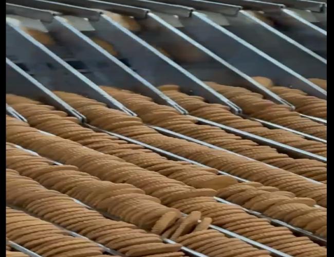 The machine is required to carry stacked & formed rows of biscuits up to packing machines. The conveyor will be provided with guidelines & biscuits will move through rows for easy lifting by packing personnel on both sides of the conveyor table. The conveyor has a separate drive with a suitable geared motor & VFD for speed control. The conveyor is used PU Belt conveyor. This machine is used in the Biscuit Industries as post-baking equipment.